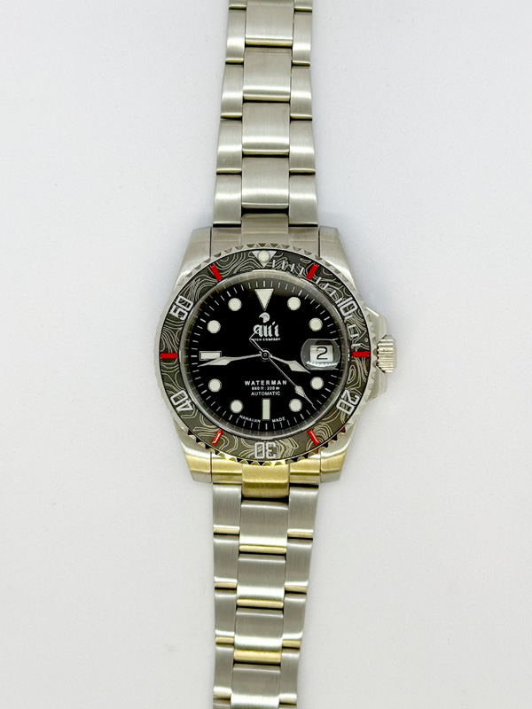 Ali'i Watch Company Waterman watch with a black bezel and carbon fiber bezel with red minute markers sits on a piece of wood.