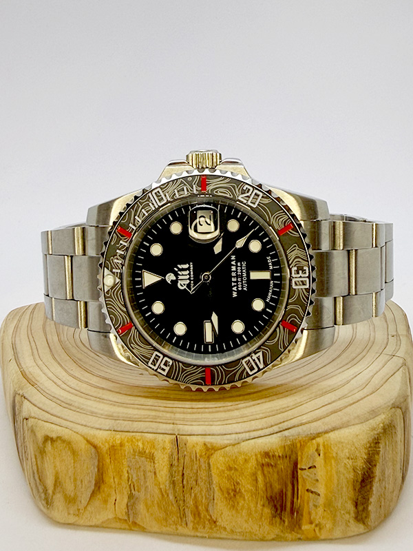 • Ali'i Watch Company Waterman dive watch with a black dial and bezel sits on a piece of wood.
