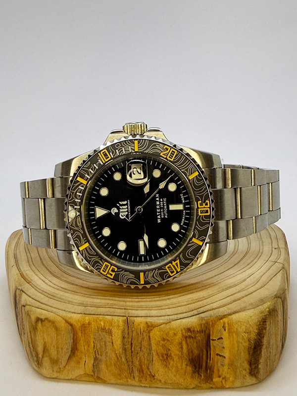 Ali'i Watch Company Waterman watch with a black bezel and carbon fiber bezel with yellow minute markers sits on a piece of wood.